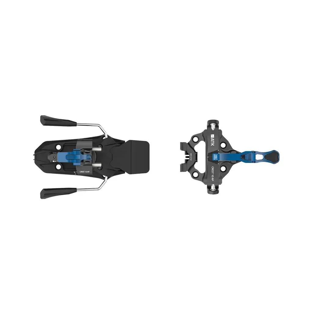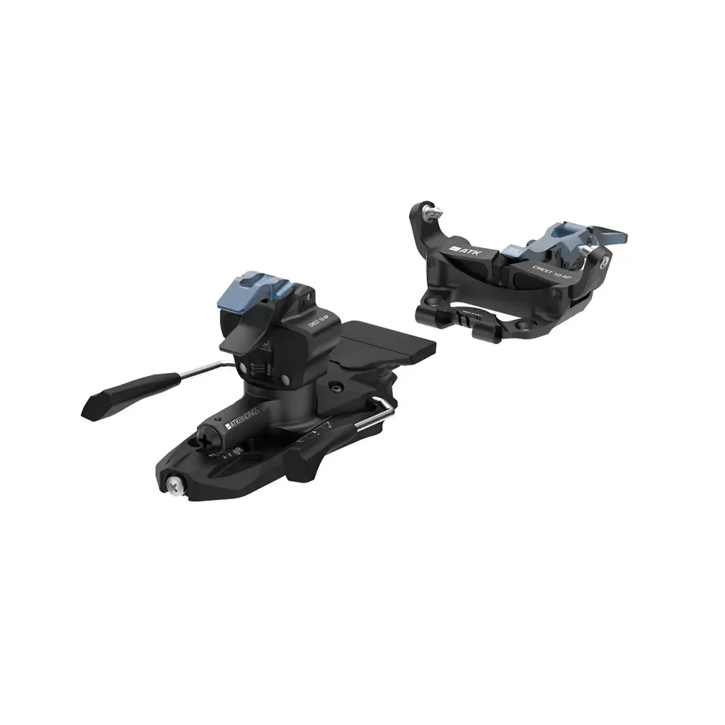 Fixations ATK Crest 10 avec freins 91 mm en Dark Blue, idéales pour les amateurs de randonnée à ski à la recherche d’un équipement léger et performant. Parfaites pour le ski de randonnée et la pratique alpine touring exigeante.