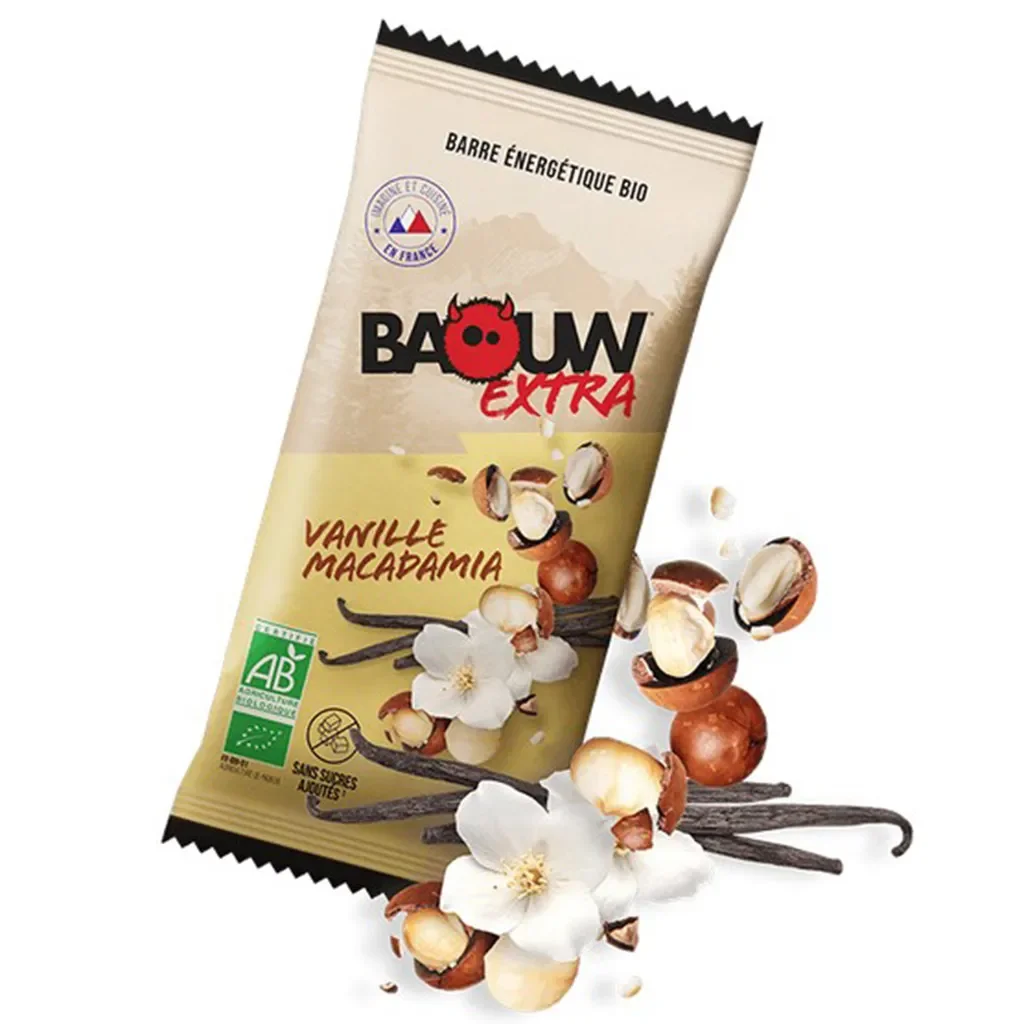La barre Baouw Extra vanille macadamia a été spécialement conçue pour les activités sportives. Elle contient tous les apports nécessaires pour environ une heure d'effort intense.