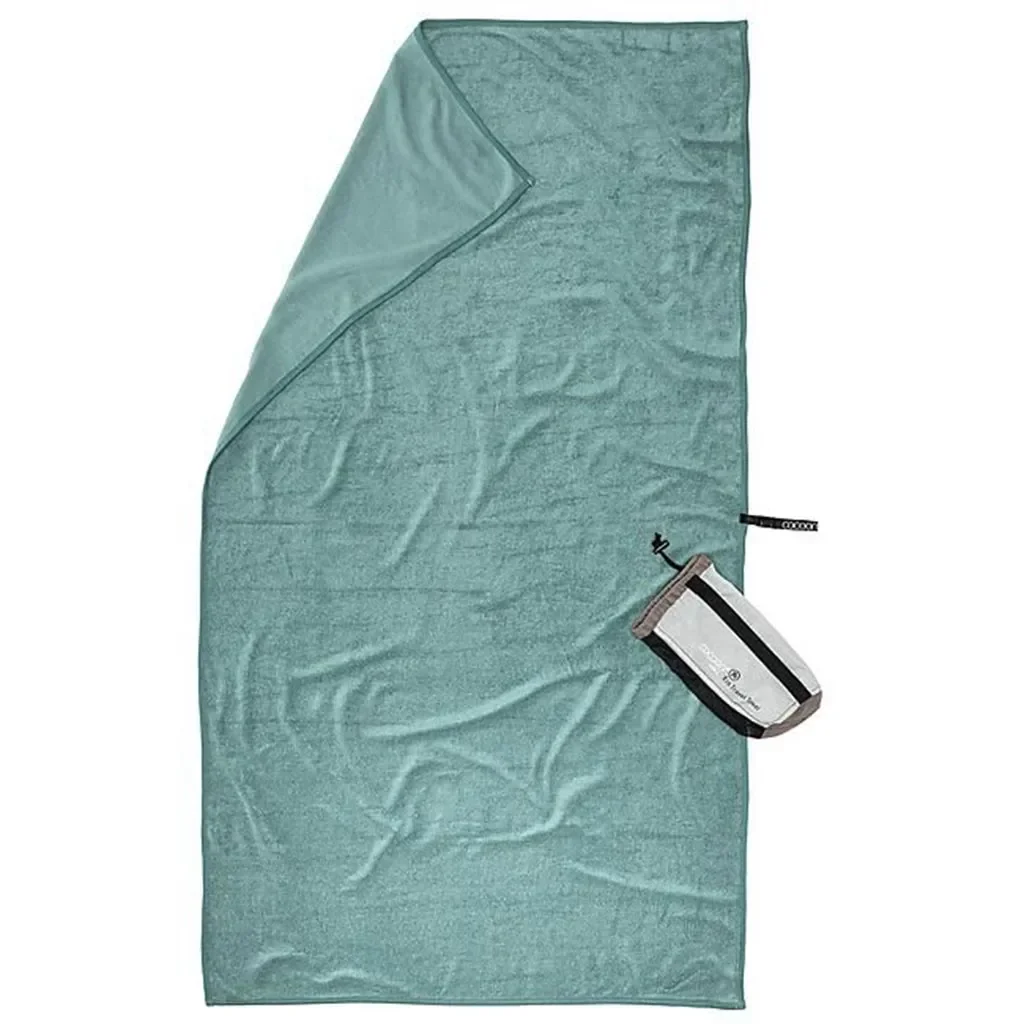 La serviette microfibre Eco Travel L de COCOON, en Nile Green, est l'accessoire idéal pour les voyageurs soucieux de l'environnement.