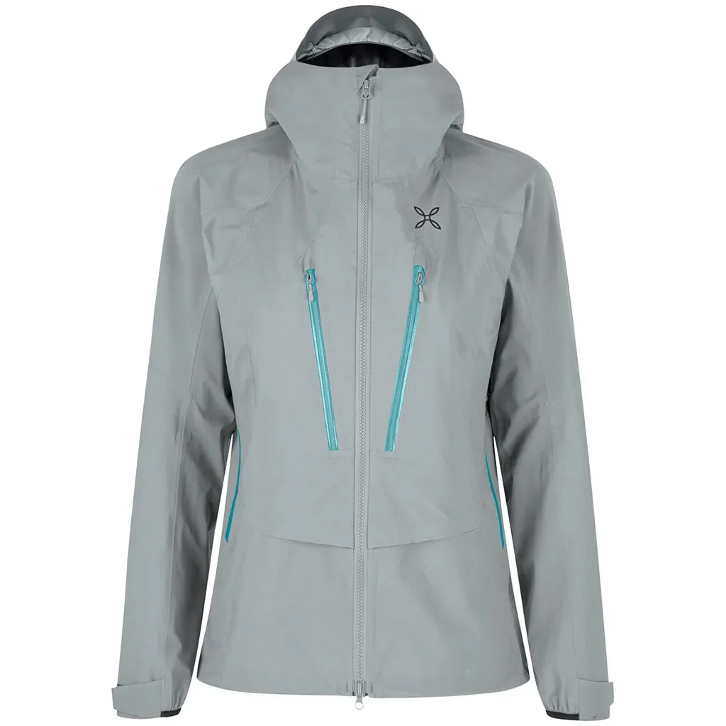 La Montura Reactive Jacket en coloris quiet grey turquoise est une veste hardshell haut de gamme conçue pour les activités de plein air, offrant une protection optimale contre les intempéries.