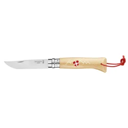 N°8 avec un manche en hêtre verni décoloré avec un cordon cuir rouge. Lame de 8.5cm en acier inoxydable et bague Virobloc pour une double sécurité.
