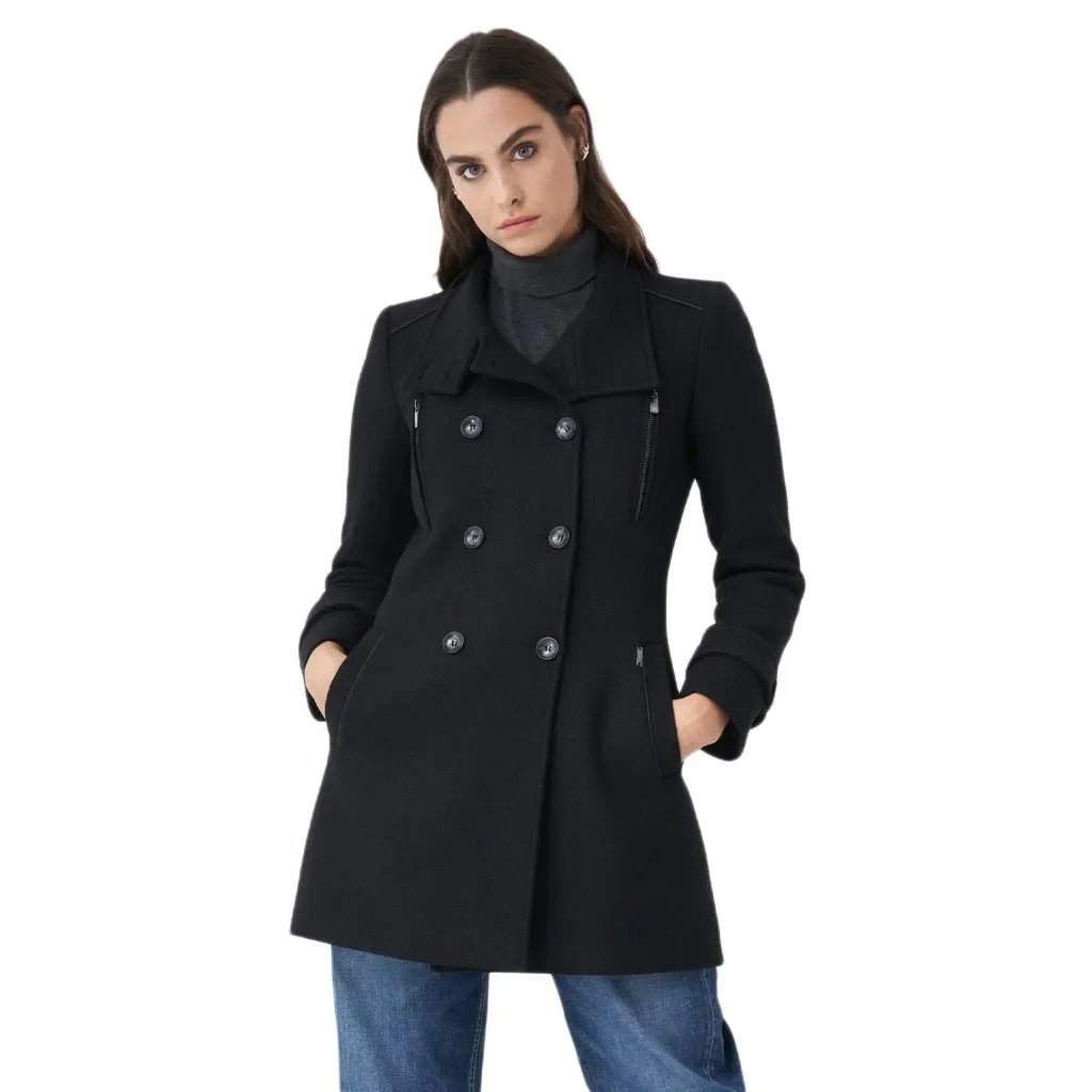 Manteau élégant et tendance. Une très belle finition avec de nombreux détails : 2 poches latérales, boutons originaux et petites épaulettes. La coupe est cintrée, féminine et cool. Sur une robe ou sur un jean cette veste est parfaite pour une look casual.