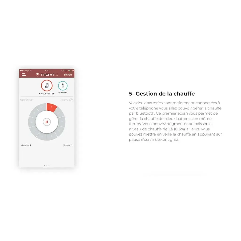 Un second écran vous permet de gérer la chauffe de vos batteries de manière individuelle. Par défaut, celles-ci sont au même niveau mais vous pouvez le personnaliser. Par exemple, vous pouvez choisir de mettre votre batterie à gauche au niveau 3 et celle de droite au niveau 9. Si vous vous rendez compte que vous avez mis la batterie « droite » sur votre pied gauche vous avez la possibilité d’échanger les batteries en cliquant au milieur sur : Changer > Curseur. Par ailleurs, vous pouvez mettre en veille la chauffe d’une ou des deux batteries en appuyant sur pause (l’écran devient gris). Quand vous revenez sur l’écran général, les modifications que vous venez d’effectuer sur chaque batterie sont visibles en bas de l'écran avec le niveau gauche et droite. Si vous décidez de changer le niveau sur l’écran général vous allez annuler la sélection individuelle et revenir à un niveau similaire pour les deux batteries.