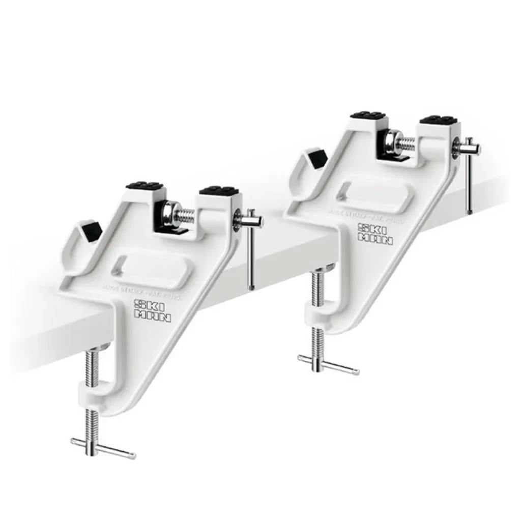 Modèle simple pour affûtage et fartage des skis. 2 appuis latéraux munis d'un système de serrage permettant de maintenir le ski sur chant. Possionner les appuis le plus proche possible de la spatule et du talon pour les bandes caoutchoutées.