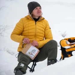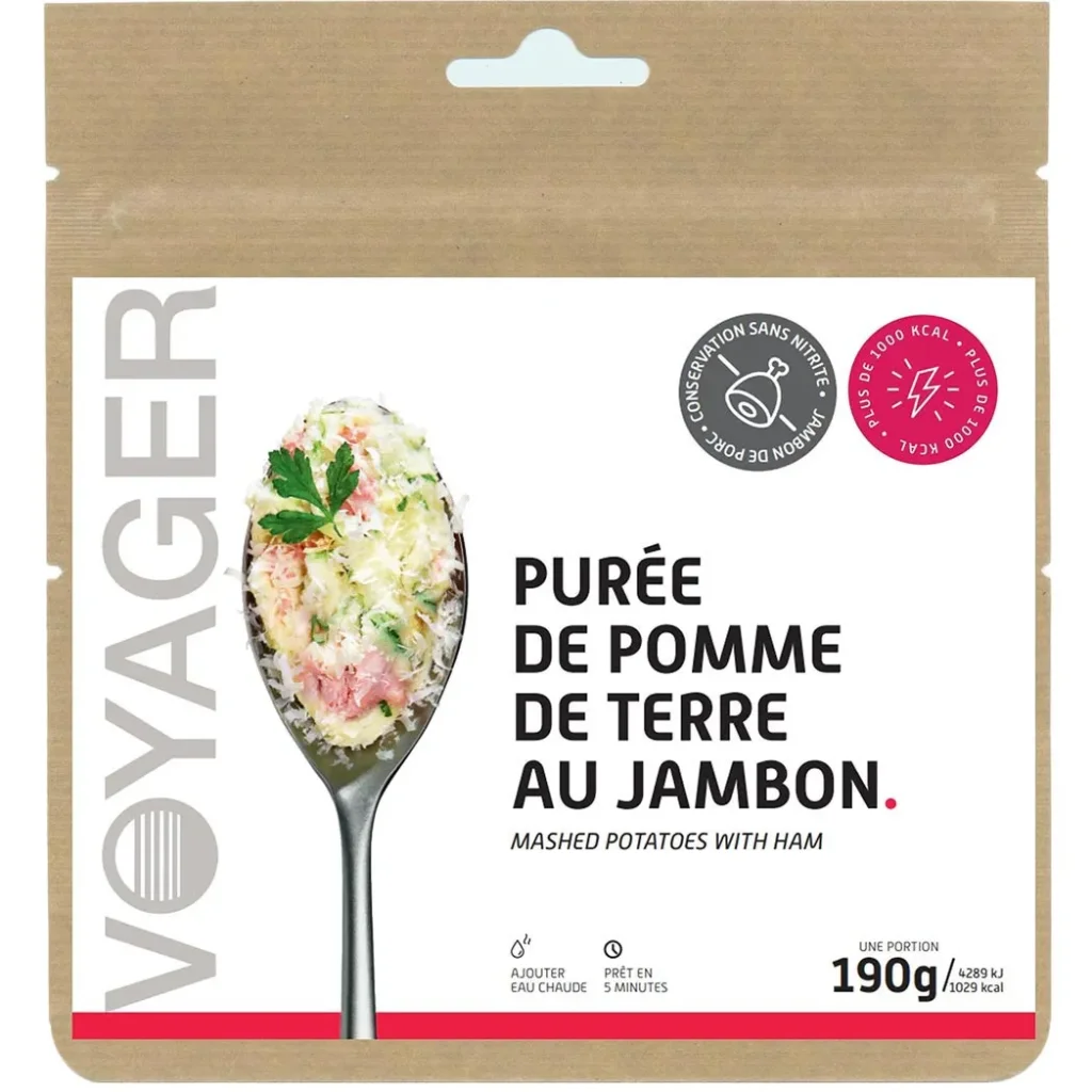 Le plat lyophiliséz Voyager, Purée de Pommes de Terre au Jambon & Fromage, est une recette généreuse et riche en énergie. Pensée pour les sorties outdoor, elle apporte chaleur, goût et nutrition dans un format compact.